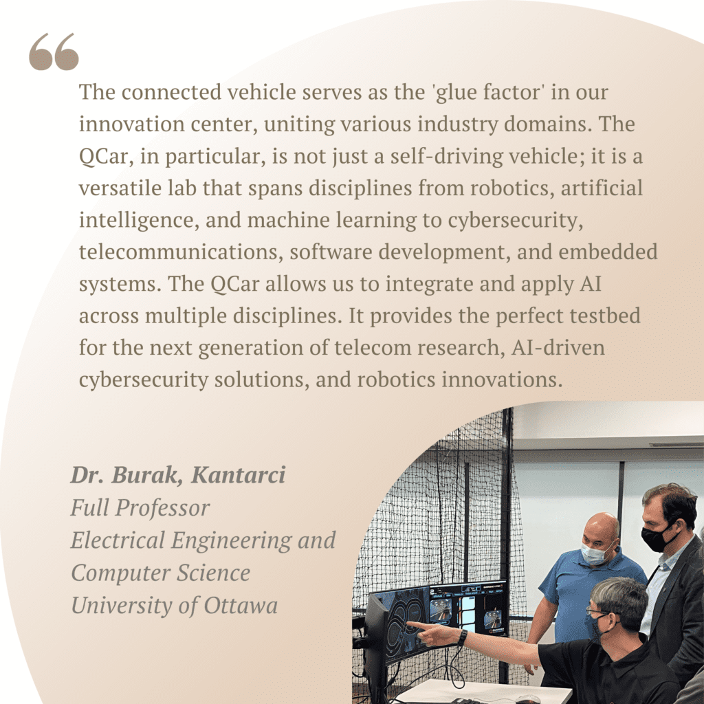Imagine having a ready-made lab ecosystem that drives innovation, research, and industry collaboration across multiple disciplines. Establishing such a lab demands expertise and collaboration—before, during, and after setup. At Quanser, with 35 years of experience, we’ve perfected this process. We partnered closely with Professor Burak Kantarci and his team, providing key support in securing funding, and consulting on setup and operations. This collaboration led to SCVIC being equipped with the Autonomous Vehicles Research Studio (AVRS) and the Self-Driving Car Studio (SDCS). The QCar, the centerpiece of SDCS, was especially pivotal due to its adaptability and wide range of applications, making it the cornerstone of innovation in SCVIC. Dr. Kantarci explained, “The connected vehicle serves as the ‘glue factor’ in our innovation center, uniting various industry domains. The QCar, in particular, is not just a self-driving vehicle; it is a versatile lab that spans disciplines from robotics, artificial intelligence, and machine learning to cybersecurity, telecommunications, software development, and embedded systems. The QCar allows us to integrate and apply AI across multiple disciplines. It provides the perfect testbed for the next generation of telecom research, AI-driven cybersecurity solutions, and robotics innovations.” This capability to integrate AI and apply it across different sectors was key to meeting SCVIC’s goal of fostering innovation through interdisciplinary collaboration.