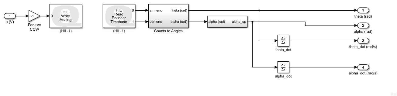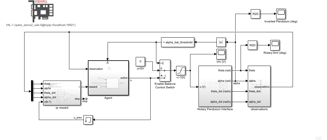 The agent was then implemented on the hardware using the following Simulink model with the Quanser QUARC real-time control software.