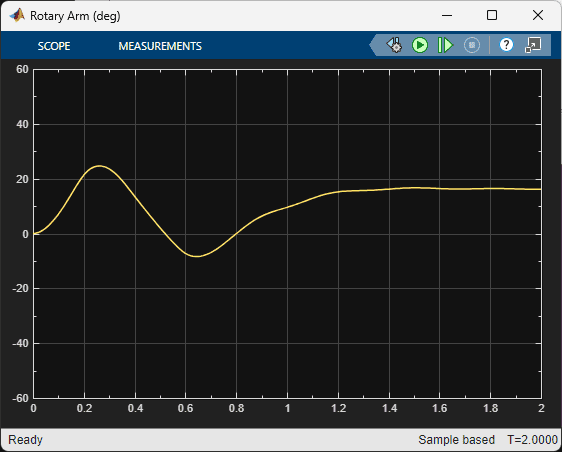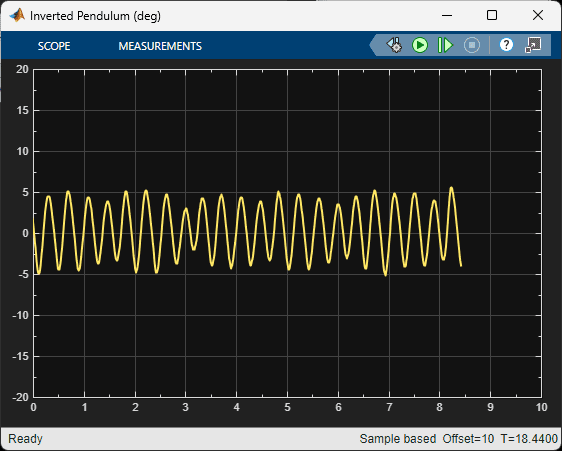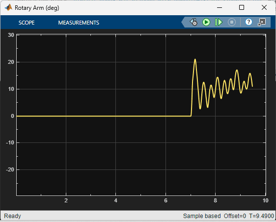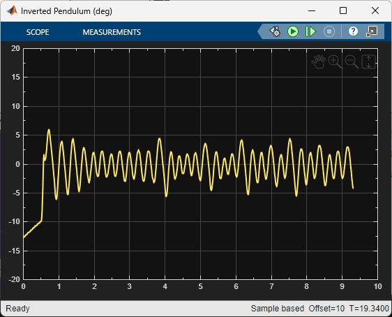The virtual twin uses a more representative model of the system than the nonlinear model that was used for the training. It incorporates DC motor friction and signal conditioning effects. As a result, the rotary arm tends to oscillate more about balance position which is more in-line with how the hardware behaves when running the balance control. This test provides some validation that the reinforcement learning agent can be realized on the actual hardware.