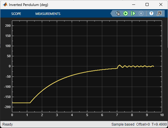 The scopes below show the response when the pendulum is rotated from the bottom downward position to the upward position. The agent engages when the pendulum is within +/- 10 deg from the vertical upright position.