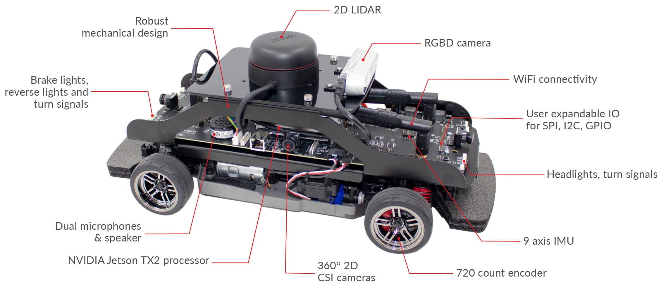 QCar, the feature vehicle of the Self-Driving Car Studio, is an open-architecture, scaled model vehicle designed for academic teaching and research. It is equipped with a wide range of sensors including LIDAR, 360-degree vision, depth sensor, IMU, encoders, as well as user-expandable IO. The vehicle is powered with an NVIDIA® Jetson™ TX2 supercomputer that gives you exceptional speed and power efficiency.